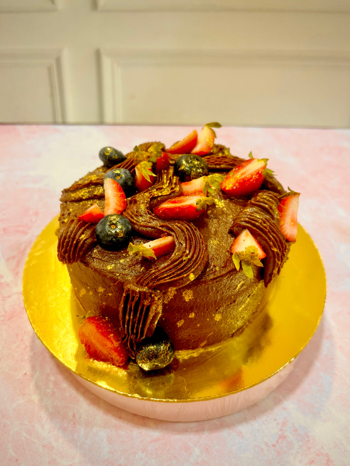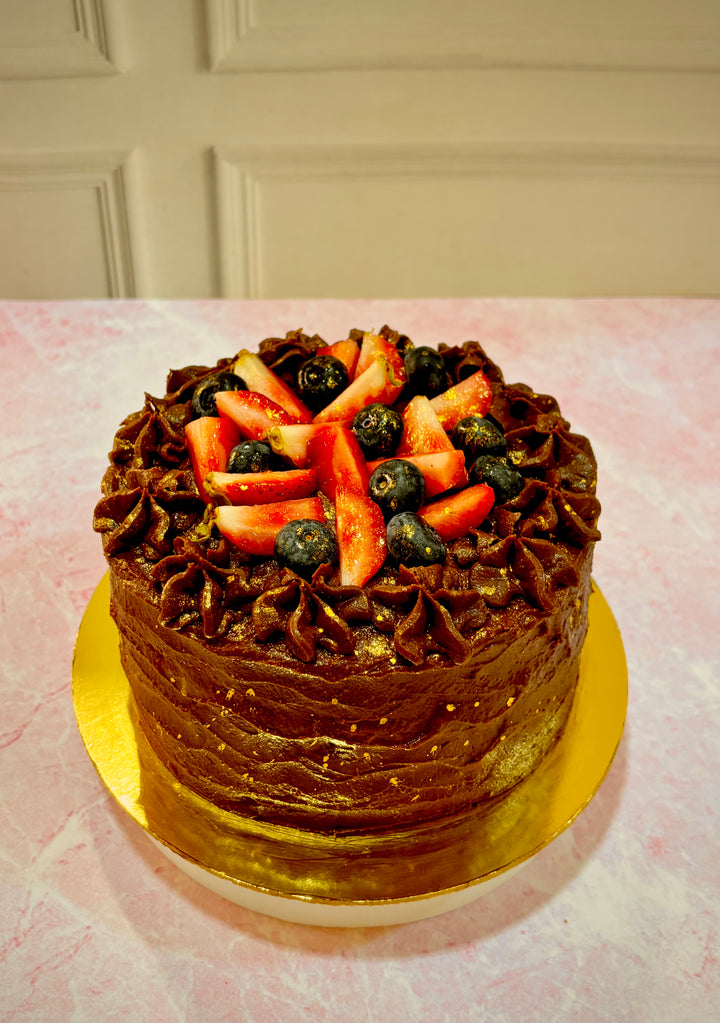 A soft millet-based gluten-free sponge layered with rich chocolate buttercream made using only sugar-free couverture chocolate and our in-house fresh berry compote, finished with a generous crown of seasonal berries.